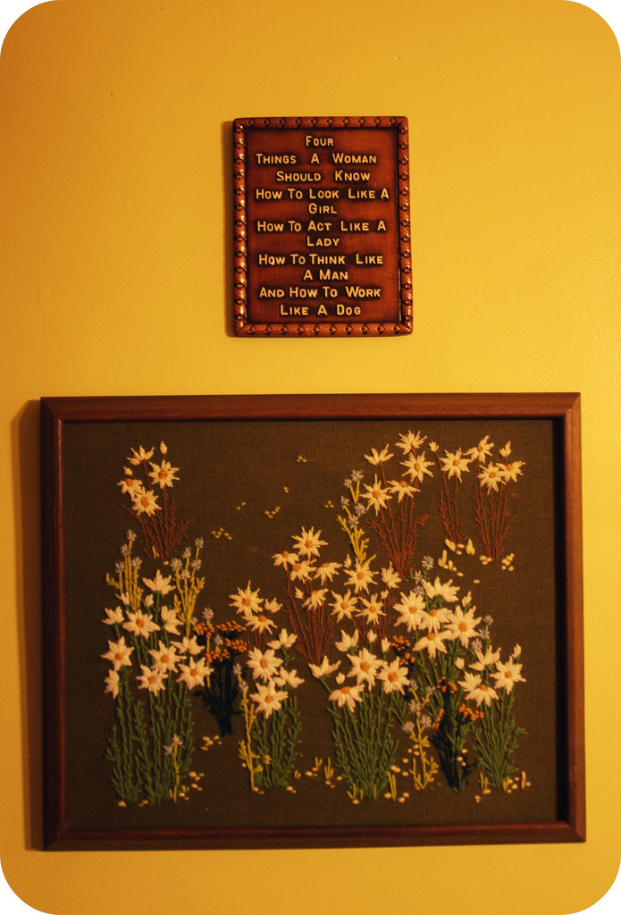 Framed daisy crewel piece, $3, Bethesda Dress for Less Thrift Store, Maplewood, Minnesota
