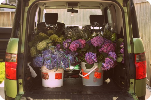 Today, I spent the entire day barefoot, on a farm, surrounded by flowers. Because tomorrow, one of my dear old friends, Jamie, is getting married. This morning, we got together arrange a whole slew of flowers at her auntie and uncle’s farm. My car was packed to the gills with blooms. It was awesome.