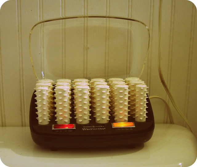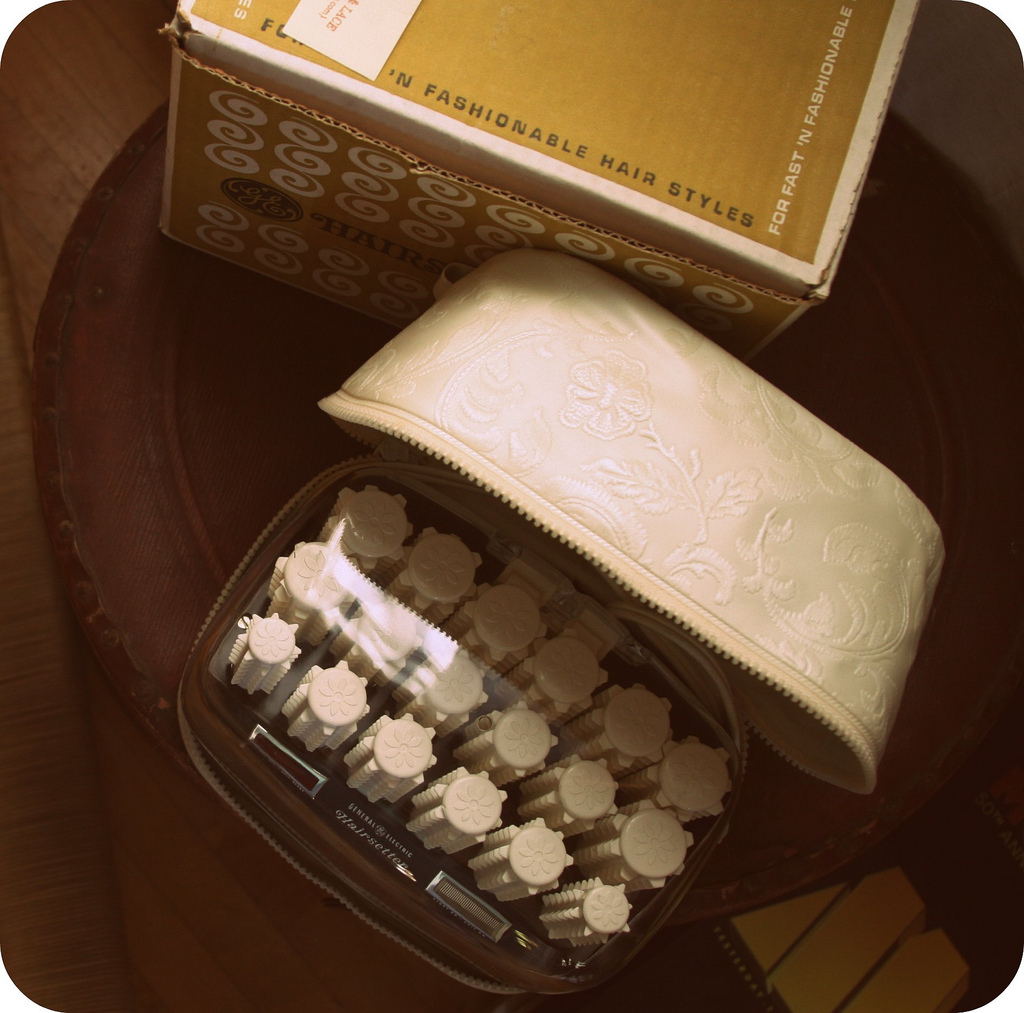 Let’s take a quick sec to talk about how awesome these are. The box? It’s original. The rollers inside appear to have never been used. Plus, every one is topped with a little flower! The icing on the cake? They come travel-ready, in a plastic, handled carrying case. Radness. Am I the only one who geeks out over shit like this?? In looooove.