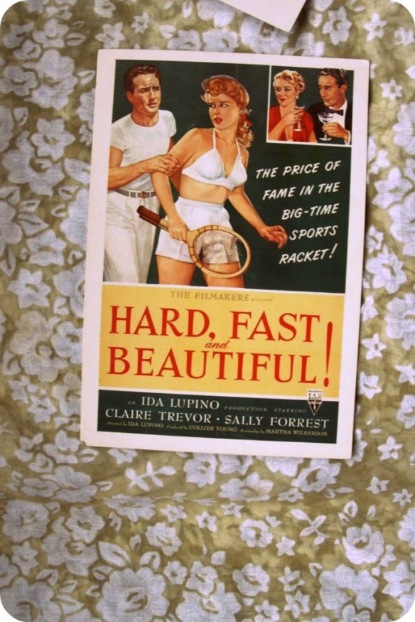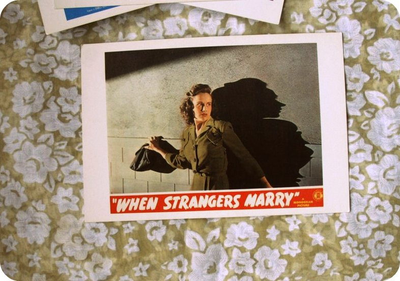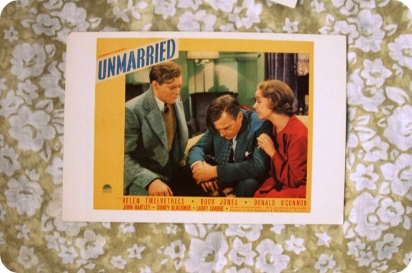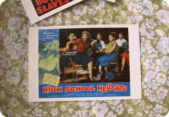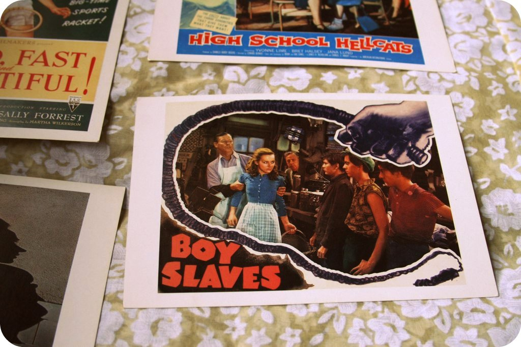 Across from the bake sale (Christmas cookies, banana bread, chocolate bark…) were a couple tables packed with rummage-y stuff (potpourri pinecones, crocheted reindeer, baseball cards, kitty calendars…). I spotted these oversized postcards featuring trash movies from the ’40s and ’50s behind some used books. I have a wee bit of an obsessive collection of vintage postcards, and figured these would make good additions. Some of the movie titles cracked me up.