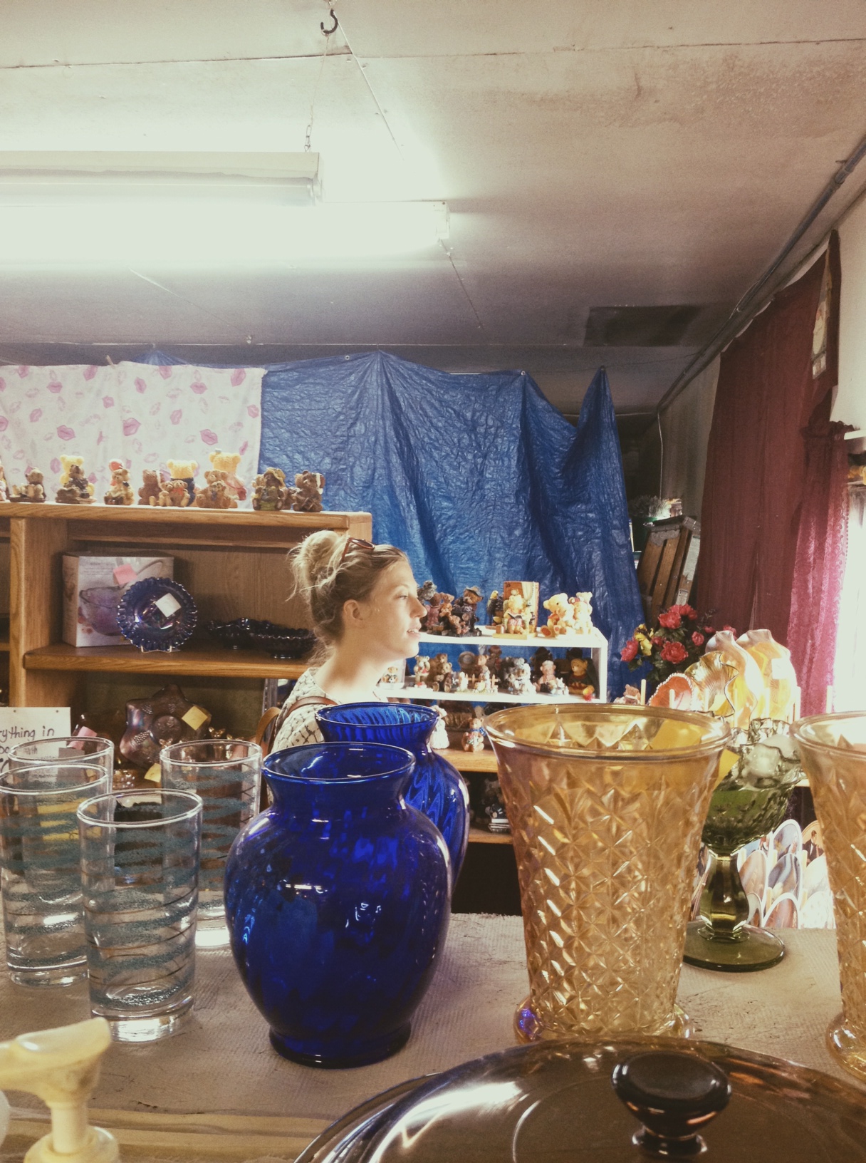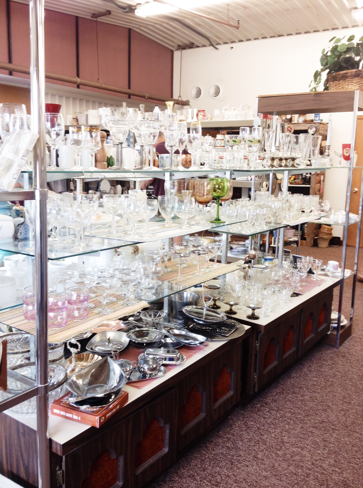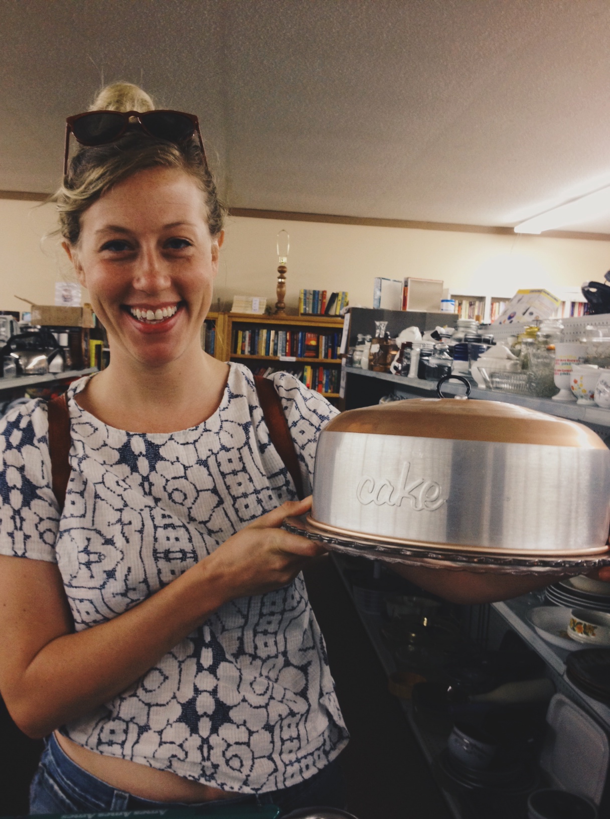 I was immediately struck by the quality of the merchandise; this is NOT one of those junky thrift stores you can find up in the country. Good Works store is large and in charge, naturally lit with big windows up front. I was really impressed by the assortment of home goods, glassware, craft supplies, lamps, side tables and books. Meggie, hunting for the cake carriers, jam jars, vases, plates and Pyrex that would bedeck her wedding tables, had TONS of luck, loading up an entire cart.