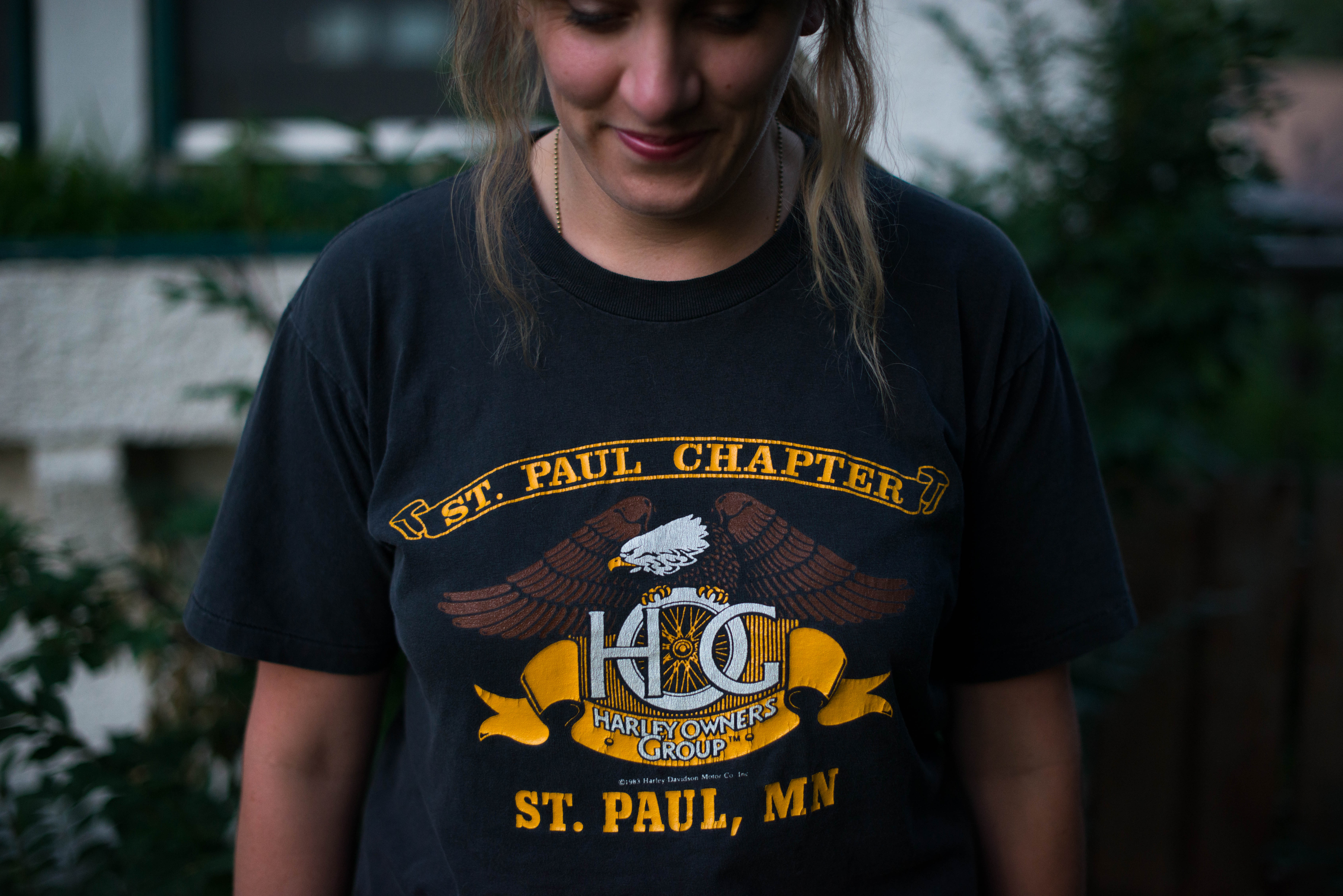 I’ve never seen myself as a jeans and T-shirt type of girl, but I have to say, there are definitely times when nothing else feels as right. The tee below I bought from a grizzled guy with a bunch of old stuff laid out on a tarp behind the “village” bar up north near my cabin. Hanging up alongside his pop-up tent was a long string of soaked Harley tees from St. Paul and Sturgis, 3 for $10.