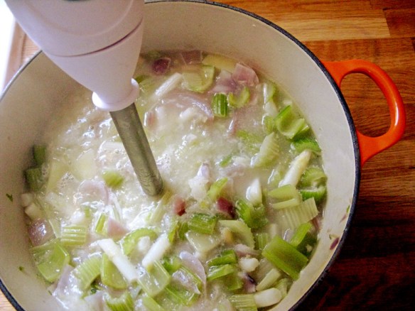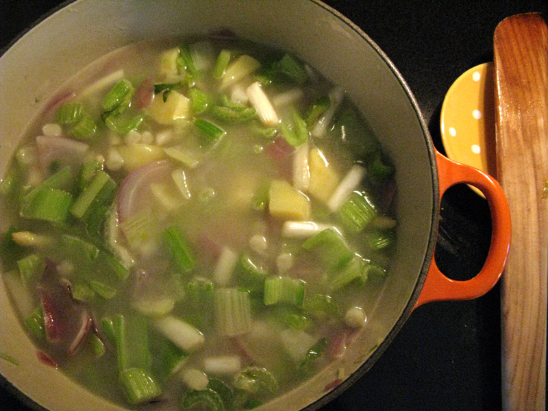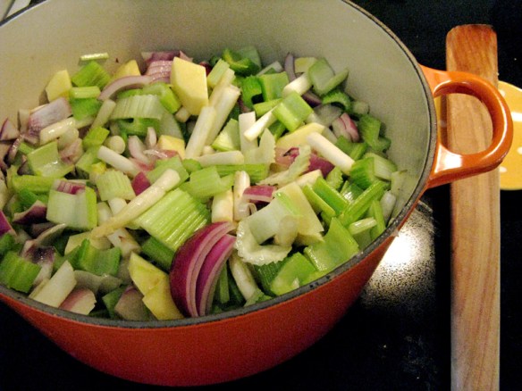 1. Wash and chop these vegetables: 1 bag/bunch of celery, a few small red potatoes (peeled), one large red onion, three cloves of garlic and one bunch of white asparagus (chop off bottoms – these are too stringy, even when blended in the soup!).