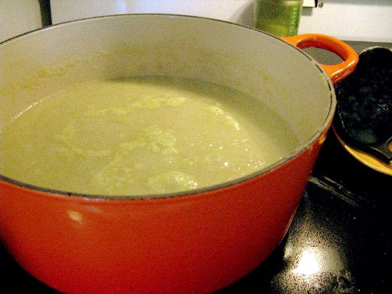 3. Add six cups chicken or vegetable stock (or water, but stock makes it more flavorful) to the pot and bring to a boil. Reduce the heat back down to medium and simmer (uncovered) until veggies are very tender—fork test them in 20 minutes.