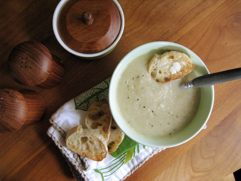 6. If you still have a few celery leaves they look pretty for garnish. I highly recommend serving this soup with some toasted slices of fresh baked baguette (I broiled them on a cookie sheet in the oven). I like them plain with butter, but you could rub them with a little garlic and olive oil before toasting—they make the best accompaniment to this spring vegetable soup. The whole thing takes less than an hour and it’s a such a treat for lunch or a light dinner or first course. As Julia Child would say, bon appétit!
