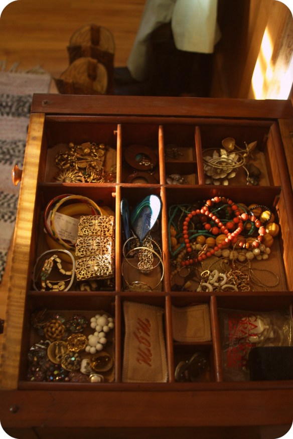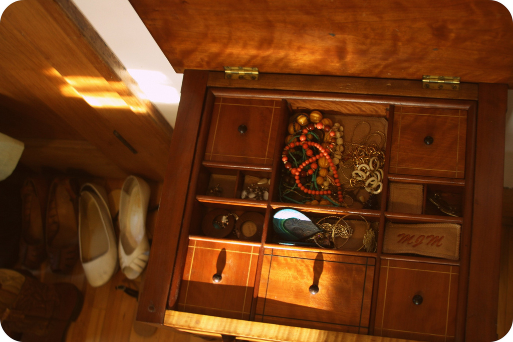 Another thing every lady should have? A treasure chest. Because ladies, of course, have a lot of jewelry. I’m lucky enough to have a treasure table. This pretty piece was made by my great-grandpa as a gift for my grandma Mary when she was a little girl (sometime in the early ’20s).