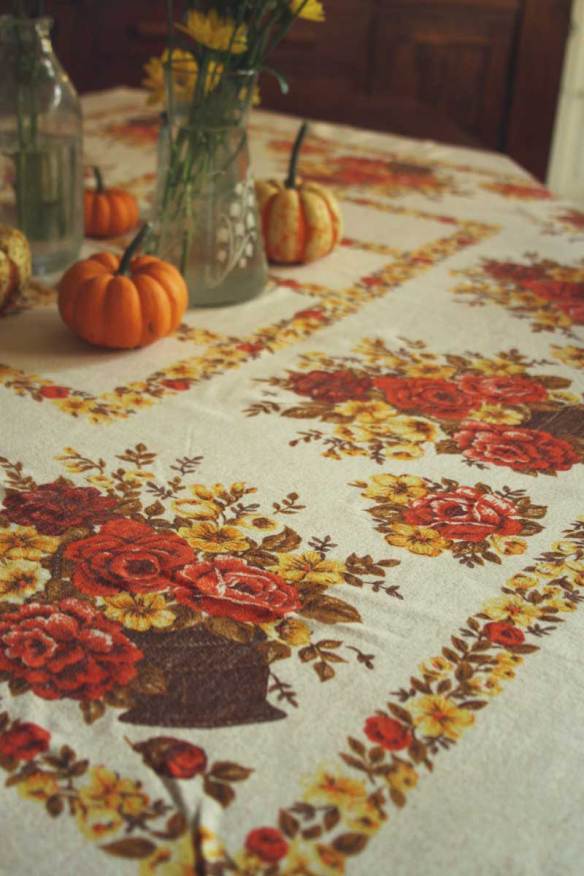 I know it’s a weakness, but I have the hardest time passing up pretty tablecloths when I find them at the thrifts or estate sales. And I have drawers stuffed full of seasonally appropriate tablecloths to prove it. There’s something about having rad linens on the table that makes me happy, and so I’ll keep on collecting until my lack of storage space forces me to surrender. In the meantime, how ’bout I share one from my stash with you every month?