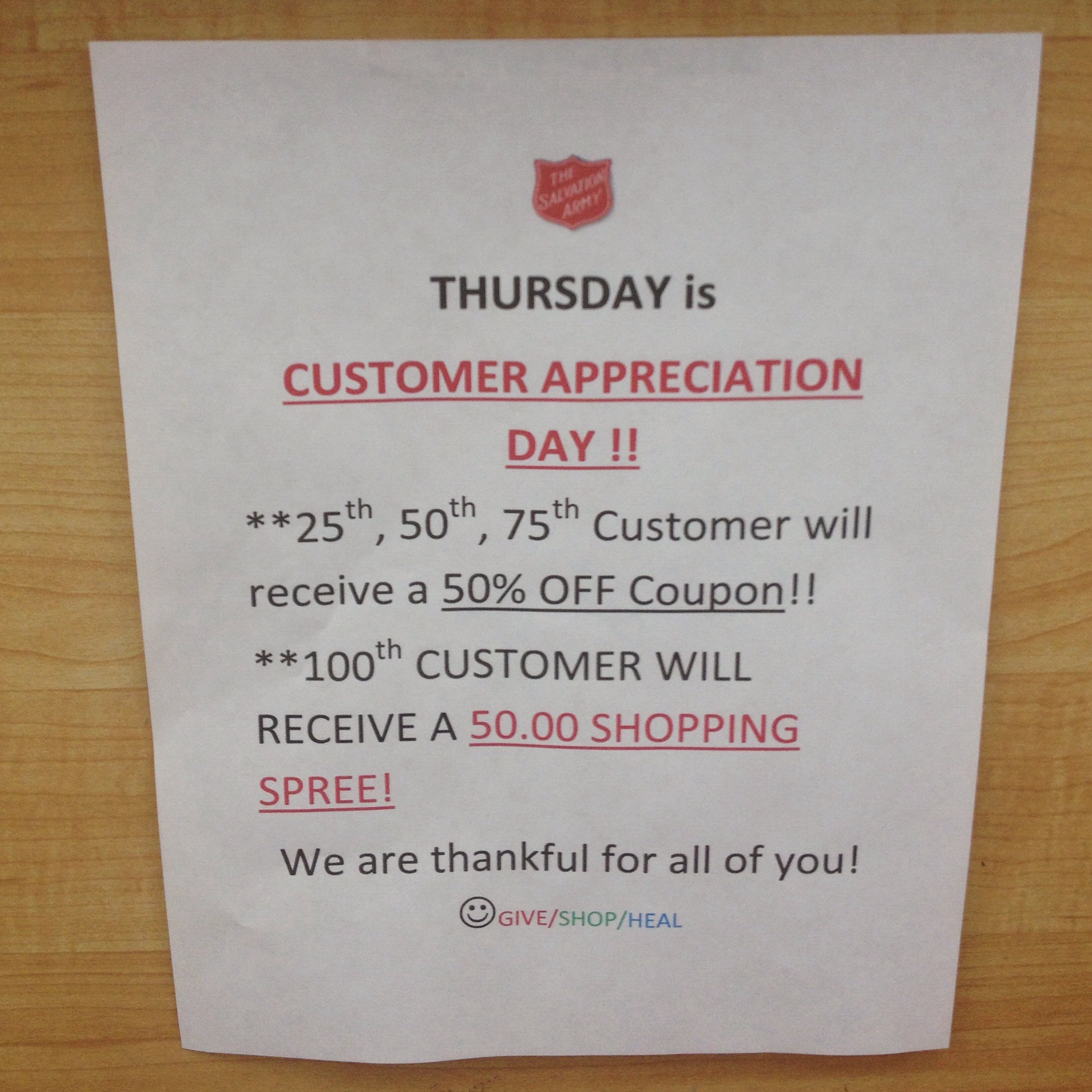 heads up: customer appreciation savings at the Burnsville Salvation Army