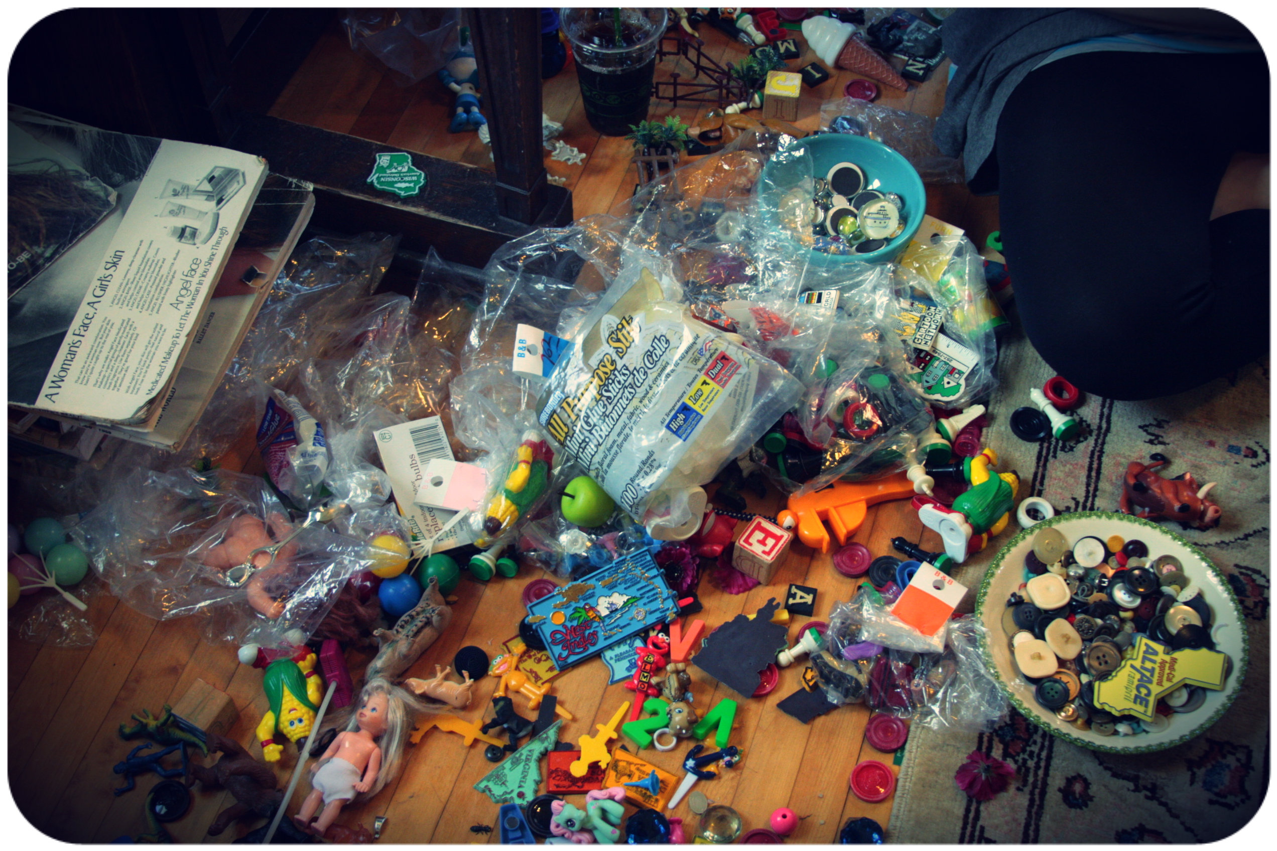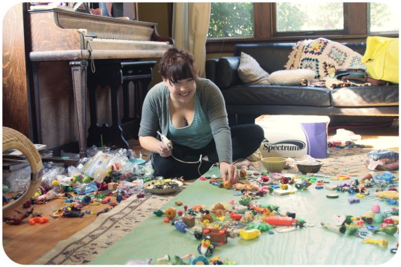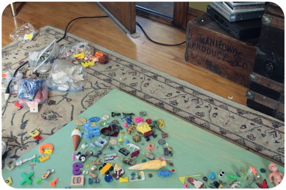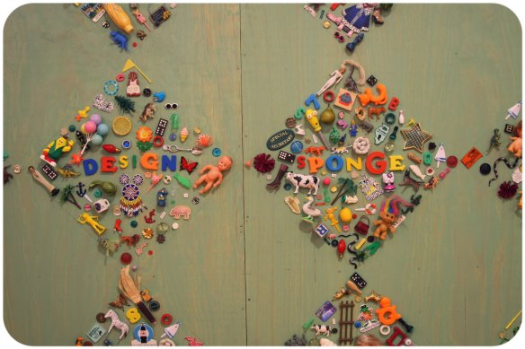 Just about a month ago, Rae and I had the opportunity to create the photo backdrop for Design*Sponge’s book party at the Anthropologie store in Edina. The 8 x 8 backdrop needed to be portable, yet sturdy, pretty from a distance yet photogenic up close. After a week of brainstorming, we settled on the idea of a trinket wall. We thrifted the trinkets (or doo-dads, as I like to call them) from Unique Thrift stores. From dolls to magnets, beads to toys, coasters to tiny plates, game pieces to buttons, nothing was safe from our glue guns.