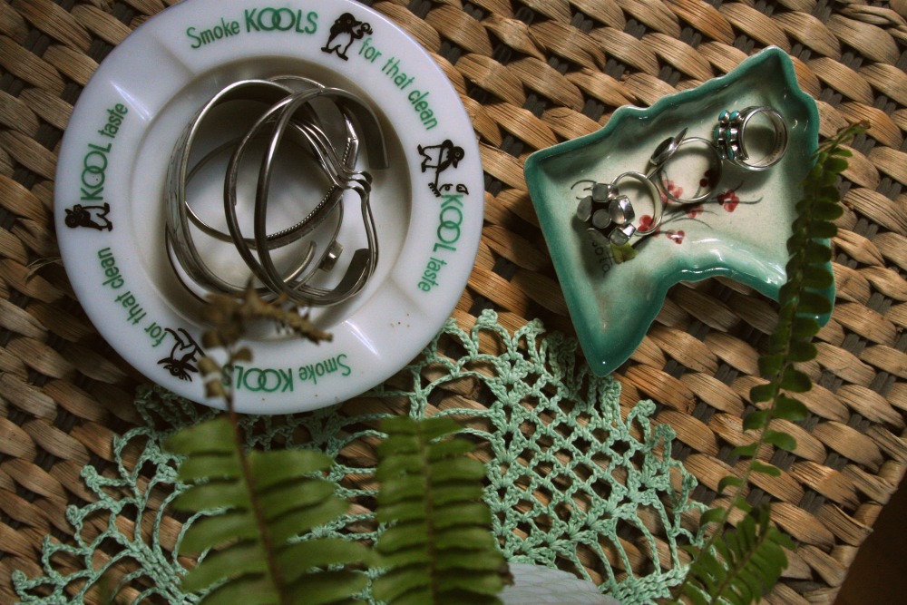 ♥ I couldn’t resist this set of Dorothy Parker wannabes, considering $3 bought me both the pitcher and set of eight glasses at One More Time. They’re fakes, but they’re MINT CONDITION FAKES so who cares? (The shot glass on the left I picked up for the cabin, and set me back a cool 25 cents.)