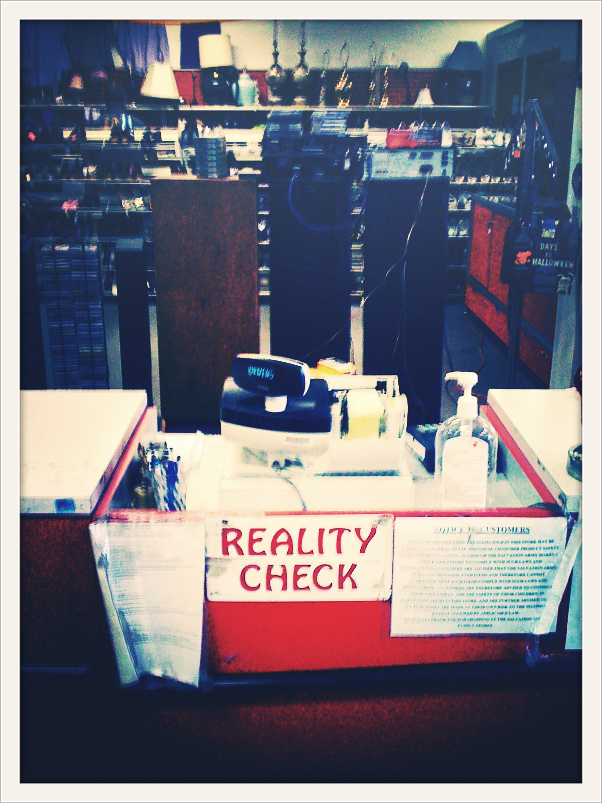 The back of the store housed humongous electronics (flat-screen TVS galore!), furniture, holiday decor and housewares sections, including some nicely priced antique-y stuff in glass cases. (Don’t overlook the jewelry—it’s all back there too, some in cases some on round racks.) This impractically gorgeous pink china cup and saucer set had to be mine.