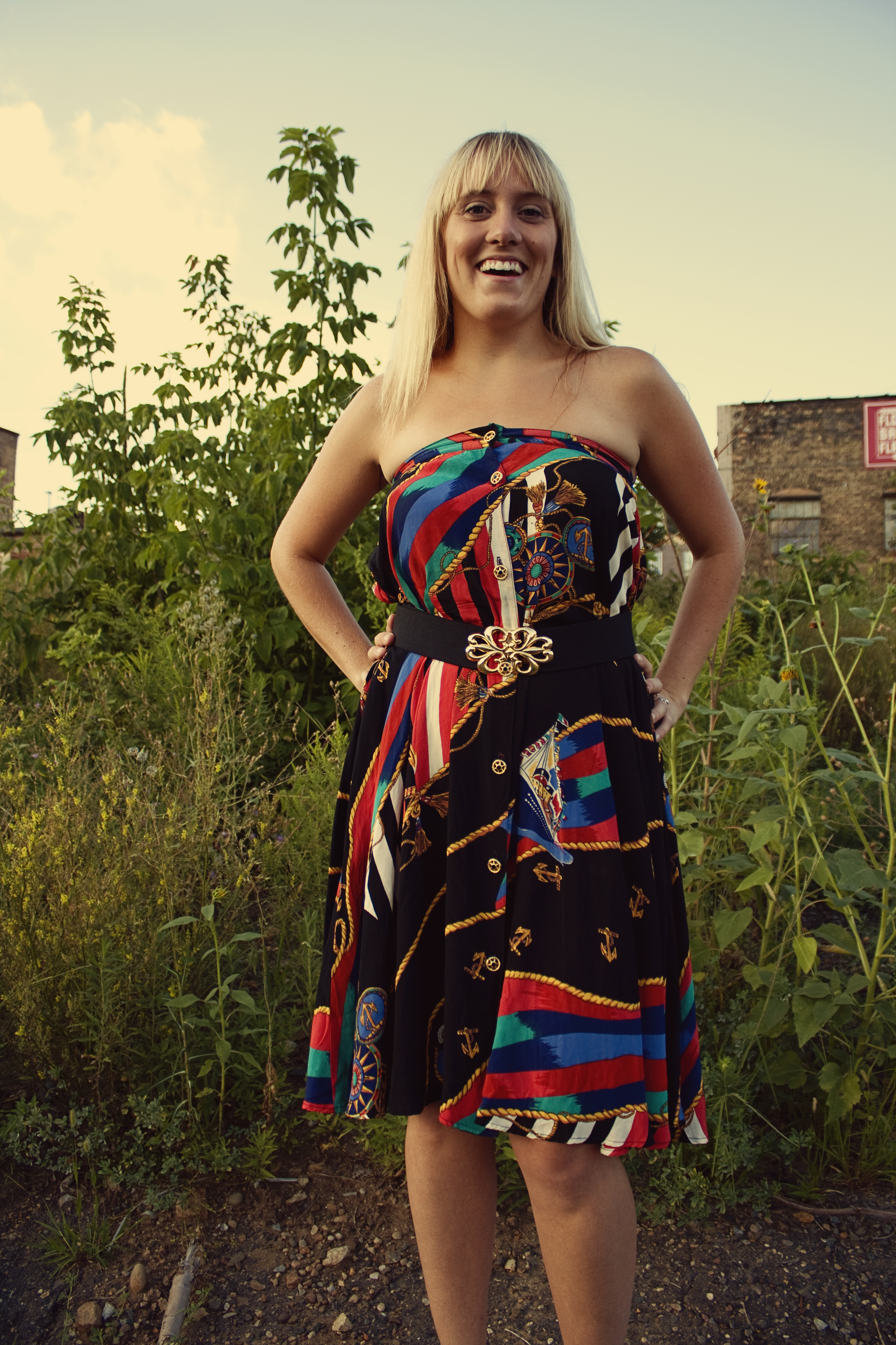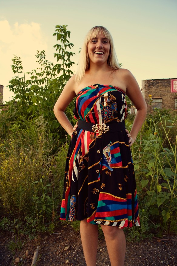Tara: The blouse and necklace are from my grandma’s closet. She’s saved every piece of clothing she’s owned since probably the ’60s. The skirt is from My Sister’s Closet on Grand Avenue in St. Paul. Tights are Topshop and the boots were my grandpa’s old work boots. The glasses are from Savers.