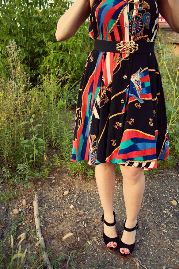It’s hit or miss with what fits me. I can’t wear any of her shoes or boots (I have big feet, sigh.), and a lot of things are too big or the styles are too long. I alter a lot of floor-length skirts so that they’re shorter and I belt some of the dresses and blouses so I actually have a waistline. But I love over-sized sweaters, so I”m in the clear there. My favorite thing is a yellow, blue, red and white-striped mod dress. It’s short, kind of jumper-like and zips up the front. Of course I wear it with very Twiggy eyeliner. And get a lot of bizarre looks on the bus.